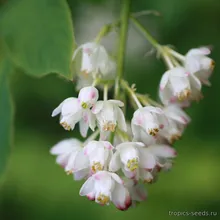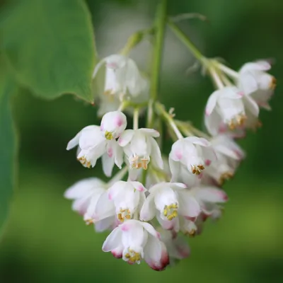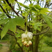 Цветки белые. Снаружи имеют розоватый оттенок. Они образуют продолговатые малоразветвленные свисающие соцветия до 15 см в длину. Форма соцветий продолговатая или яйцевидная. Такие соцветия могут содержать до 40 цветков. Их аромат слаб, но приятен. Цветут они в период после распускания листьев в течение 25 дней. Чашелистики также имеют яйцевидную форму, снаружи немного розоватые. Лепестки цветков белые, имеют ту же длину, что и чашелистики, однако более узкие. Тычинки имеют голые (редко - волосистые) нити. Цветет в мае. Медонос. Плод-коробочка. Она одно- или двусеменная, широко-обратнояйцевидной формы, вздутая, 2-3-лопастная. Плоды созревают в июле-сентябре.