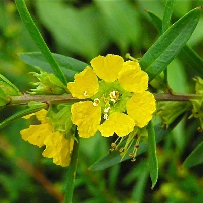 Куст высотой до 3 м с жёлтыми, очень красивыми цветками диаметром 2-3 см, которые привлекают пчел и других насекомых, имеющими по 5 чашелистиков. Листья 1 см шириной и 2-5 см длиной.