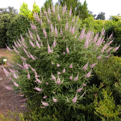 Витекс представляет из себя крупный куст до четырех метров в высоту, может быть сформирован в виде штамбового деревца. Цветки мелкие, собраны в кисти, фиолетового, синего, розового или белого цвета. Достоинством витекса священного является также то, что он начинает цвести в конце года, когда большинство из садовых растений уже отцвели.