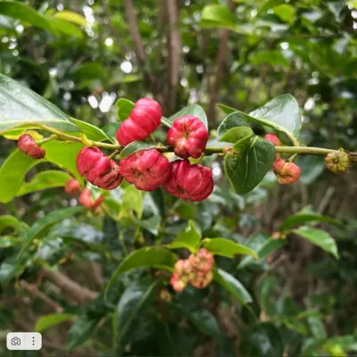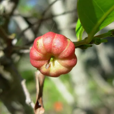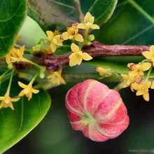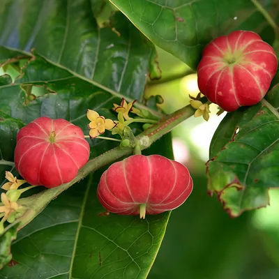 Плоды маленькие, в форме тыквы, сначала зелёные, а затем приобретают оттенки белого и розового. Разделены радиально на сегменты, в конце концов раскрываются, обнажая ярко-красные семена диаметром 0,5 см.