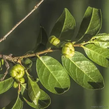 Растёт в виде древесного кустарника или небольшого дерева высотой до 8 метров, хотя иногда достигает 30 метров. Кора шелушащаяся коричневато-серая. Листья простые эллиптические, длиной 3–10 сантиметров и шириной 1,5–4 сантиметра. Зимой вид может быть частично листопадным. Цветение может происходить в любое время года. Есть как одиночные женские, так и мужские цветки, которые встречаются группами по три. Цветки обоих полов зелено-жёлтые, с мужскими цветками около 0,7 см и женскими — 0,5 см в диаметре.