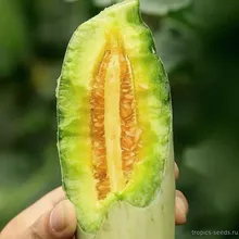 Огурдыня АЛЕКСАНДРИЯ - суперранняя (36-40 дней). Растение длинноплетистое, образует 2-3 порядковых боковых побегов, на которых в основном и формируется урожай. Плоды округло-цилиндрической формы, длиной 40-60 см, иногда вырастают и за 80 см. В технической спелости – молочно-белые, со вкусом огурца, их можно солить, мариновать, даже жарить как кабачки, есть сырыми, в биологической спелости – плоды желтеют, появляется дынный аромат, мягкость и сладость. Кожица тонкая, на вкус приятная и сладкая. Хороша в кулинарных шедеврах, плодоносит очень долго.