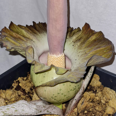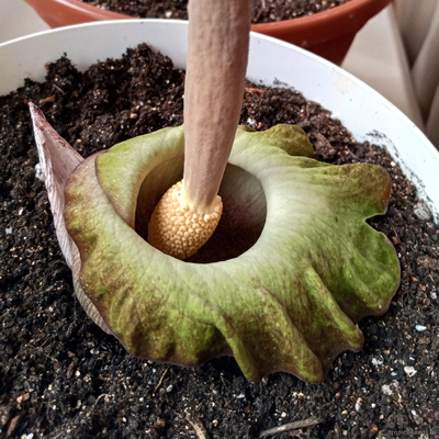 Весной зрелые клубни сначала производят крупный цветок, цветение длится 5 дней. Неприятный запах, который сопровождает цветение, длится всего пару часов. Цветы однодомные, отдельно цветы мужского или женского пола, но цветы обоих полов могут быть и на одном растении.